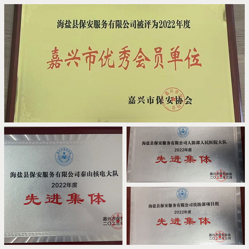 在全市保安协会三届五次理事会上,海盐县保安服务有限公司荣获“2022年度嘉兴市优秀会员单位”荣誉称号,公司技防部项目组、人防部人民医院大队、秦山核电大队分别荣获“2022年度保安系统先进集体单位”,公司陈惠良、方汛等7名同志获“2022年度保安系统优秀个人”。