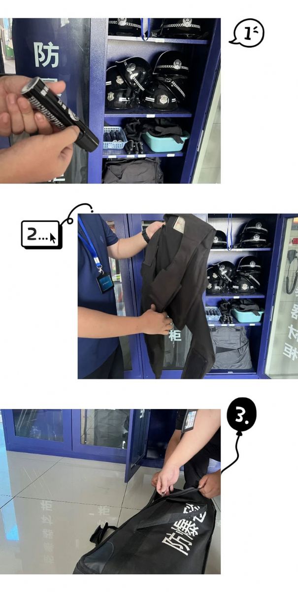对防刺服、辣椒水、防暴盾牌、钢叉、抓捕器、勤务盔、防割手套、强光手电、橡胶棍等护学装备细致检查,确保各类装备齐整,性能完好,状态“满格”。